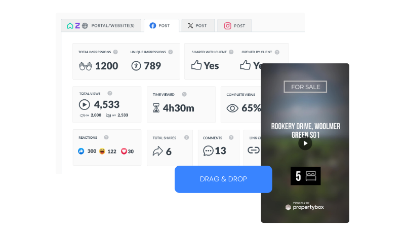 Drag and drop templates transform property images into branded visuals and reels, automatically populated with the right details. Branding stays consistent whether content is going to Facebook, Instagram or LinkedIn.